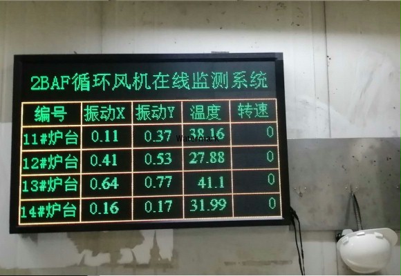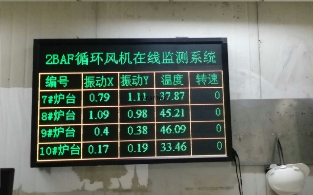 某钢铁公司有十多座罩式炉,每个罩式炉都有一个风机,风机的振动及轴温转速都需要实时监测,便于现场工人直接察看电机况,配上一个LED显示屏,同时显示每个电机的状况参数。